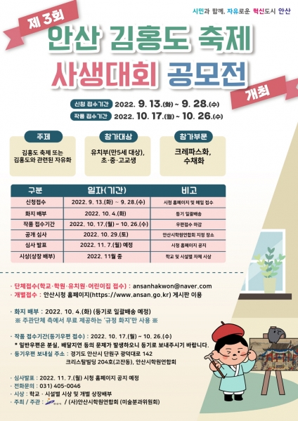 [금요저널] 안산시는 안산 출신 천재화가 김홍도를 주제로 만5세 이상 유치원생 및 초·중·고교생을 대상으로 한 ‘제3회 김홍도 사생대회 공모전’을 개최한다고 13일 밝혔다.