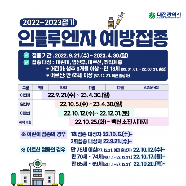 [금요저널] 대전시는 오는 9월 21일 어린이를 시작으로 임신부, 만 65세 이상 어르신, 취약계층에 대한 인플루엔자 예방접종을 순차적으로 실시한다고 밝혔다.