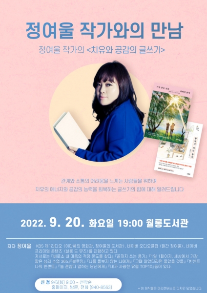 이번 작가와의 만남은 9월 독서의 달을 맞아 ‘치유와 공감의 글쓰기’라는 주제로 마련됐으며 일상생활과 여행에서 배운 삶의 지혜를 공유하고 관계와 소통의 어려움을 겪는 이들에게 상처를 치유하는 글쓰기의 힘에 관한 이야기를 나눌 예정이다.