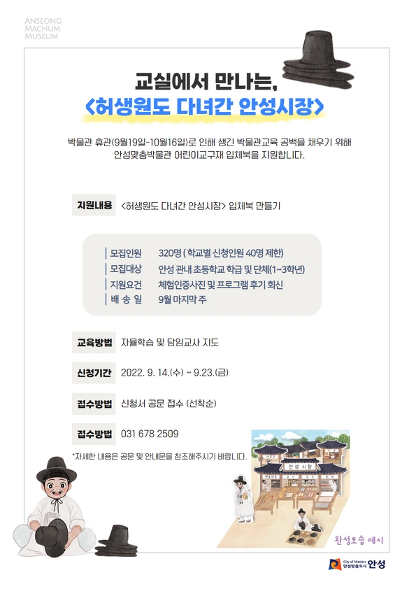 [금요저널] 안성시 안성맞춤박물관에서는 9월 14일부터 23일까지 관내 초등학교를 대상으로 2022년 ‘허생원도 다녀간 안성시장’ 교구재 지원 신청을 모집한다.