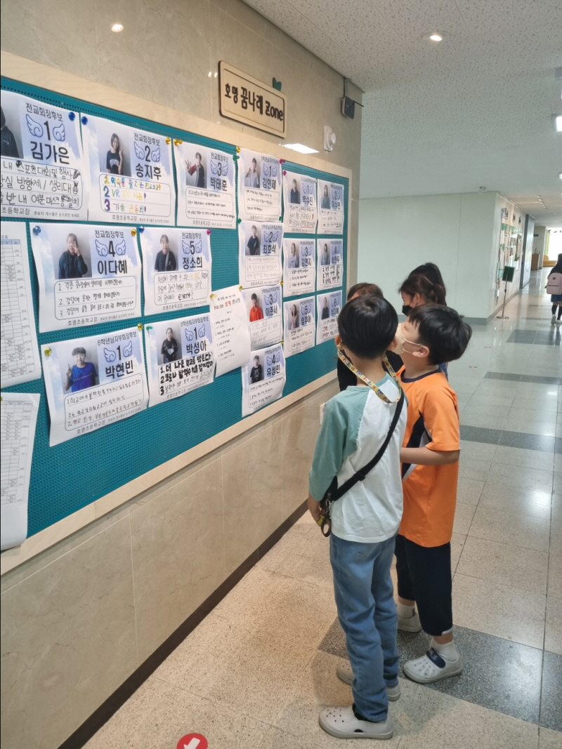 □ 전교학생회 선거에서는 6학년 회장에 5명, 6학년 부회장에 남 1명·여 1명, 5학년 부회장에 남 4명·여 6명이 후보자로 등록하여 교내 게시판에 후보자들의 공약이 담긴 선거 포스터를 게시하였다. 소견발표 영상을 학교 홈페이지에 업로드한 후 4~6학년을 대상으로 현장 투표를 실시하였다.