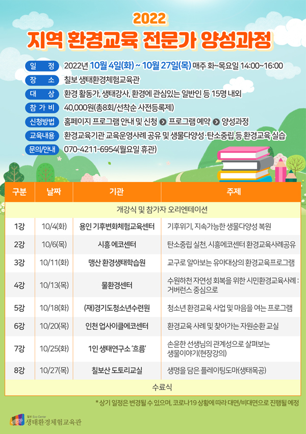 [금요저널] 수원시 칠보생태환경체험교육관이 ‘지역 환경교육 전문가 양성 과정’ 교육에 참여할 수강생 15명을 30일까지 선착순으로 모집한다.