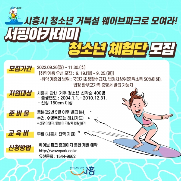 체험단 신청 대상은 2004년 1월 1일 이후에서 2010년 12월 31일 이전에 출생한 시흥시 거주 청소년으로 신장 150cm 이상이면 누구나 서핑 체험단이 될 수 있다.