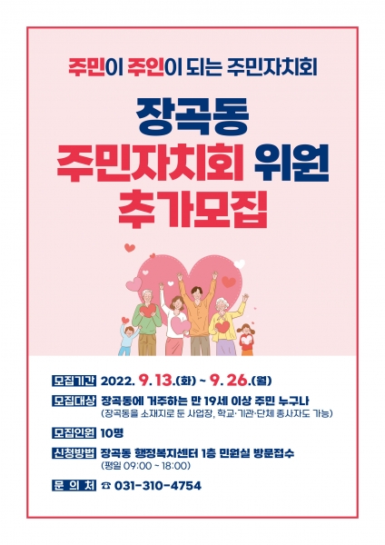 [금요저널] 장곡동 행정복지센터는 2023년 주민자치회를 이끌어갈 장곡동 주민자치회 위원을 9월 13일부터 26일까지 추가 모집한다.