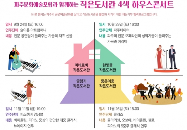 [금요저널] 파주시는 관내 작은도서관 4개소에서 오는 24일부터 11월까지 클래식과 재즈 공연을 하우스콘서트 형식으로 개최한다고 밝혔다.