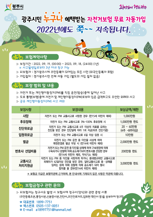 [금요저널] 광주시는 자전거 이용 중 발생하는 불의의 사고에 대비해 ‘2022년 광주시민 자전거 보험’을 갱신 가입한다고 16일 밝혔다.