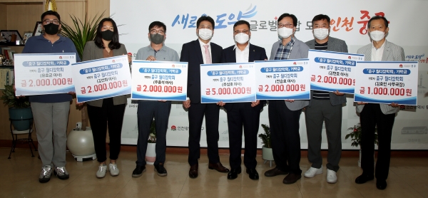 기탁자들은 중구 월디장학회 임원들로서 인천종합어시장 사업협동조합 유기붕 조합장 500만원, 인성코퍼레이션㈜ 추성호 대표 500만원, 부흥환경 진양걸 대표 500만원, 대동학생백화점 전승호 대표 200만원, 청원조경㈜ 김선희 대표 200만원, ㈜다올정보통신 주종석 대표 200만원, 누리디자인 유호균 대표 200만원, 광고마을 김현호 대표 200만원, ㈜재영건설 엄혜찬 대표 100만원, 중구 월디장학회 김호민 사무국장 100만원을 중구청을 방문해 장학금을 기탁했다.