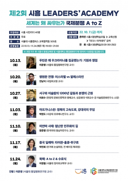 [금요저널] 시흥시는 서울대학교 통일평화연구원과 함께 오는 10월 13일부터 11월 24일까지 총 7회에 걸쳐 ‘제2회 시흥 리더스 아카데미’를 운영한다.