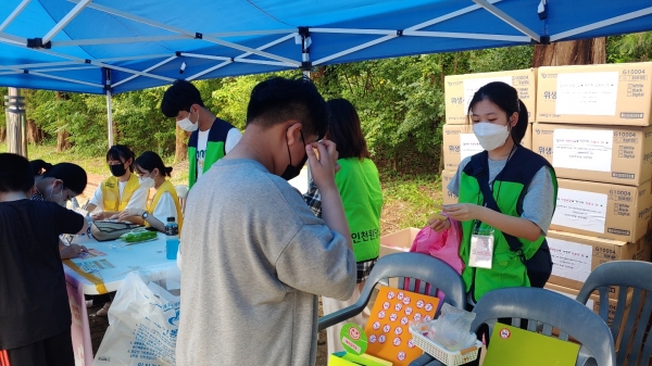 [금요저널] 인천광역시교육청 청소년 방역자치단은 18일 인천대공원 문화광장에서 시민 대상 코로나 블루 극복을 위한 캠페인을 진행했다.