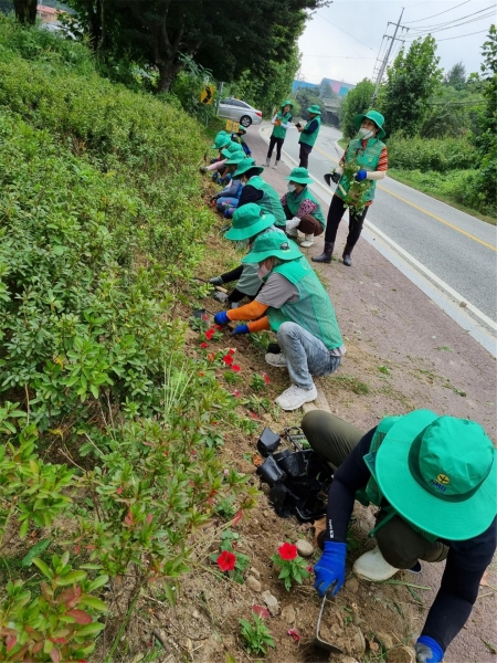 이날 마장면 새마을지도자들은 이치1리 회전교차로 근방, 각평리 마을 출입구 등에 꽃묘를 식재했다.