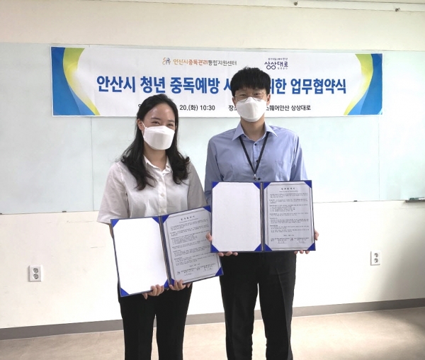 경기내일스퀘어안산 상상대로에서 진행된 협약식은 정사임 안산시중독관리통합지원센터장, 문지원 경기내일스퀘어안산 상상대로 센터장이 참석한 가운데 진행됐다.