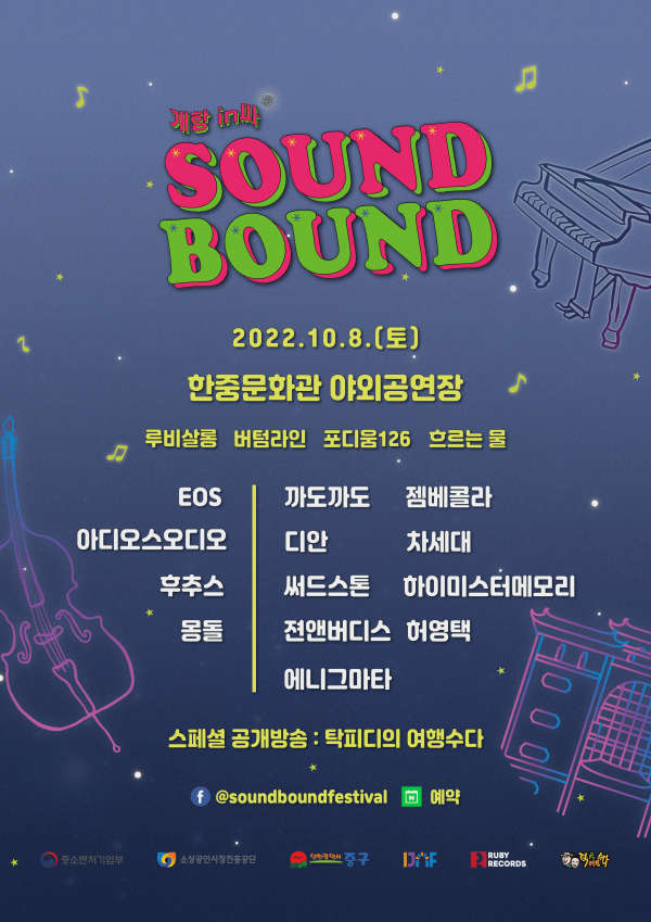 [금요저널] 인천중구문화재단은 10월 8일 한중문화관 야외공연장과 지역의 복합문화공간에서 개항희망문화상권 원도심의 활성화와 지역 예술인 성장을 위해 공간과 음악의 이야기를 담은 지역 음악 축제‘개항in싸 사운드 바운드’를 개최한다.