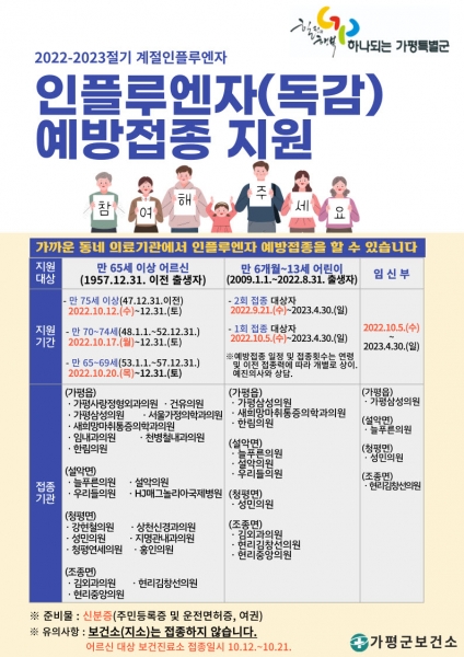 [금요저널] 가평군은 9월 21일부터 예방접종 위탁의료기관에서 인플루엔자 국가 예방접종이 시작된다고 밝혔다.