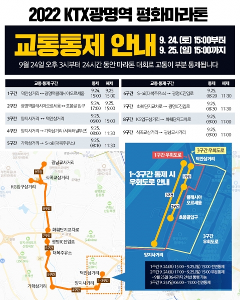 대회 전일인 24일 오후 3시부터 대회 당일인 25일 오전 6시까지 덕안삼거리에서 광명역클래시아오르세움 앞 대로변에 이르는 구간이 전면 통제되며 통행 차량은 LH광명시흥지사 앞 도로 방면으로 우회해야 한다.