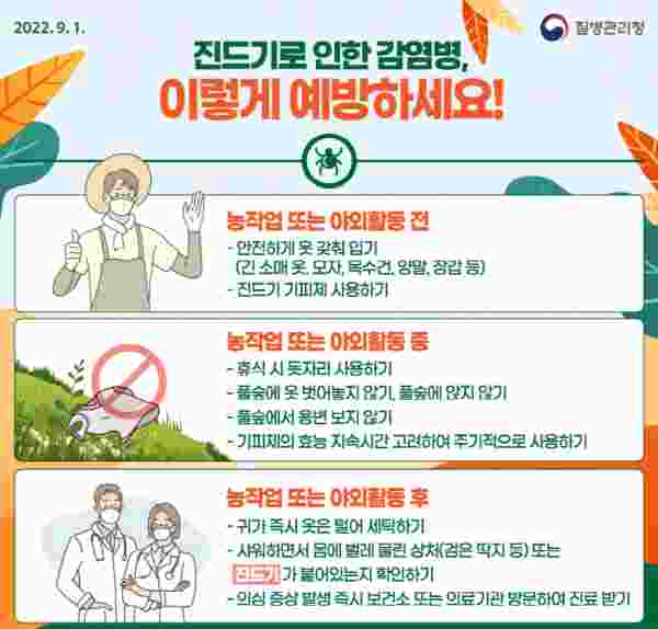 야외활동 시 피부 노출을 최소화하는 복장을 착용하고 진드기 기피제를 사용하는 것이 안전하며 야외활동 직후 옷은 바로 세탁해야 한다.