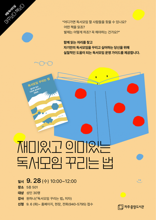 권예자 중앙도서관장은 “이번 강좌를 통해 파주시민들이 독서모임을 결성하고 운영해 함께 읽고 소통하며 사고와 관계를 확장하는 계기가 되기를 바란다”고 전했다.
