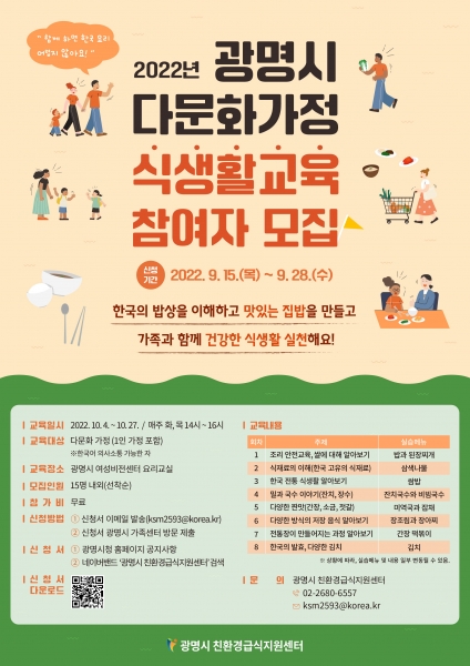 [금요저널] 광명시는 10월 4일부터 10월 27일까지 다문화가정을 대상으로 한국 음식문화에 대한 이해와 바른 식생활 실천을 위한 ‘2022년 광명시 다문화가정 식생활 교육’을 운영한다.