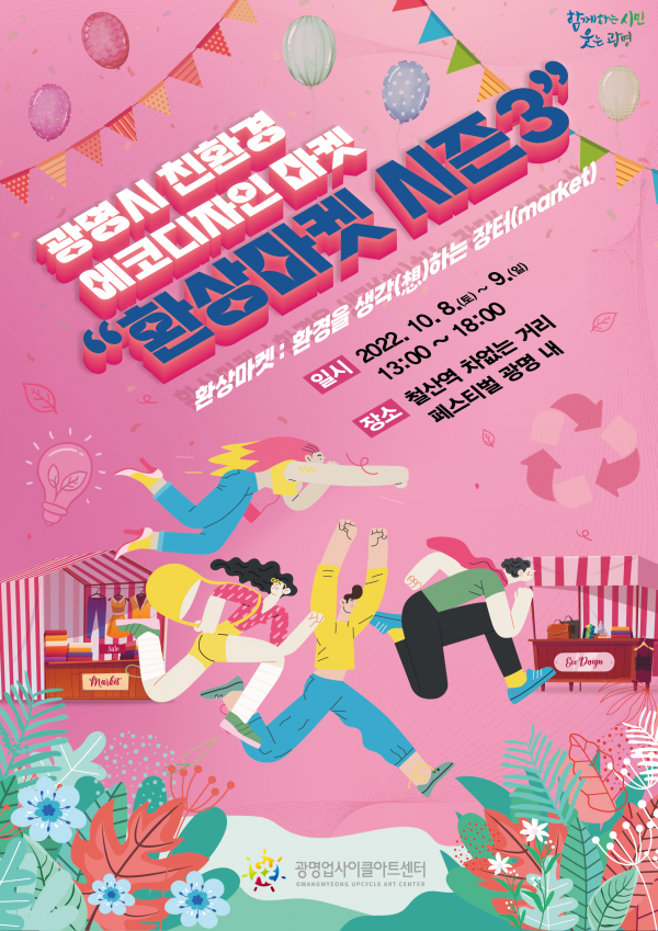 [금요저널] 광명시 광명업사이클아트센터에서 운영하는 광명경기문화창조허브는 10월 8일과 9일 오후 1시부터 6시까지 철산역 앞 8차선 차 없는 거리에서 친환경 에코디자인 마켓 ‘환상마켓 시즌3’을 개최한다.