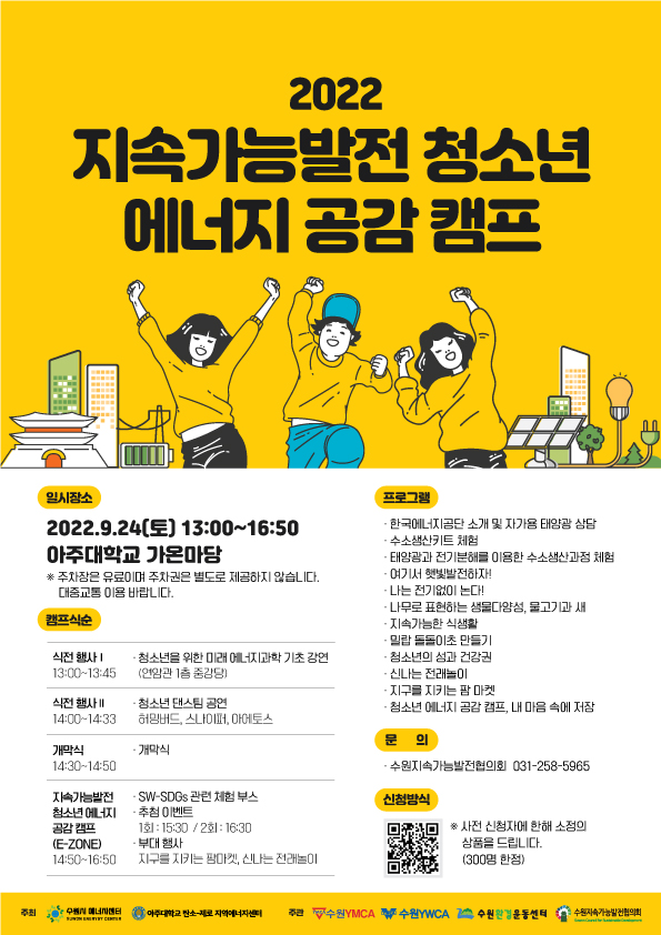 [금요저널] 수원시 에너지센터는 24일 오후 1시 아주대학교 가온마당에서 ‘2022 지속가능발전 청소년 에너지 공감캠프’를 연다.