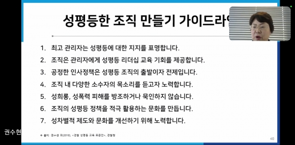 ‘함께 만드는 성평등 조직 문화’를 주제로 강의한 권수현 평등공작소나우 대표는 성인지 관점의 중요성 성인지 관점과 조직 문화 성평등 조직 문화를 만드는 관리자의 리더십 등을 설명했다.