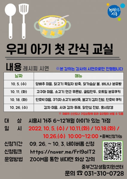 [금요저널] 시흥시 중부건강생활지원센터에서는 영유아의 건강한 식습관 형성 및 성장발달을 위한 ‘우리 아기 첫 간식 교실’을 오는 10월 5일과 11일 18일 26일 에 운영한다.