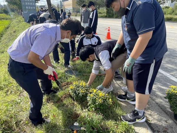 [금요저널] 파주시 파주읍 주민자치회와 세경고 학생 및 교직원은 지난 23일 파주읍 술이홀로 도로 일대 100여 미터 구간에 국화꽃 1,500여 본을 식재하는 ‘가을꽃 심기 행사’를 펼쳤다.