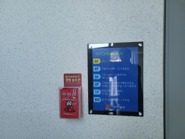 [금요저널] 인천중구시설관리공단은 지난 15일 중구청사와 영종 제2청사를 대상으로 화재시 유독가스로 인한 질식을 방지하기 위한 화재대피용 생명 숨수건함 설치를 완료했다.