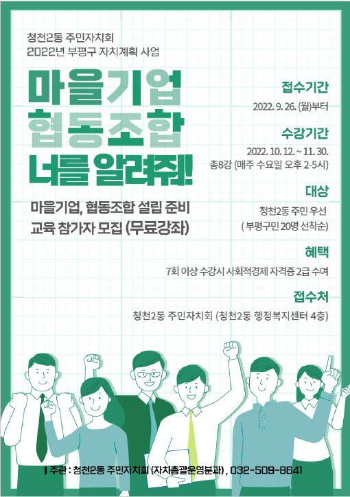 [금요저널] 부평구 청천2동 주민자치회는 26일 2022년 주민총회 의결사업인 ‘마을기업, 협동조합, 너를 알려줘’에 함께할 참가자 20명을 선착순으로 모집한다.