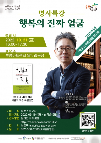 [금요저널] 부평구 구립도서관이 다음달 21일 개최될 명사특강 ‘행복의 진짜 얼굴’ 참여자를 26일부터 선착순으로 모집한다.