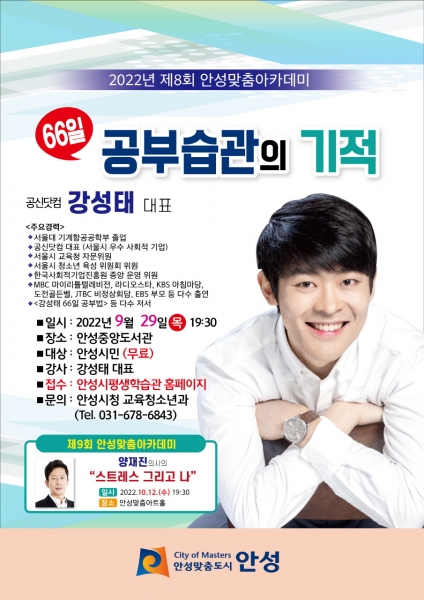 [금요저널] 안성시는 오는 29일 저년 7시 30분 안성중앙시립도서관 다목적홀에서 공신닷컴 강성태 대표를 초청해 ‘66일 공부습관의 기적’을 주제로 제8회 안성맞춤 아카데미를 개최한다.