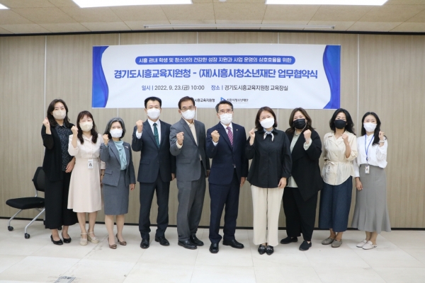 지난 23일 경기도시흥교육지원청에서 진행된 업무 협약식에는 경기도시흥교육지원청 이상기 교육장, 행정국 이정식 국장, 초등교육지원과 허남진 과장, 중등교육지원과 홍수민 과장과 시흥시청소년재단 이덕희 대표이사, 시흥시청소년수련관 관장 직무대행 강유선, 시흥시청소년상담복지센터 소장 이주원 등 관계자 10명이 참석했다.