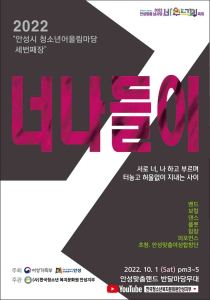 안성시와 여성가족부가 주최하고 한국청소년복지문화원 안성지부가 주관하는 ‘너나들이’는 ‘2022 안성맞춤 남사당 바우덕이 축제’가 열리는 안성맞춤랜드에서 청소년들이 주체적으로 기획한 축제의 한마당으로 펼쳐진다.