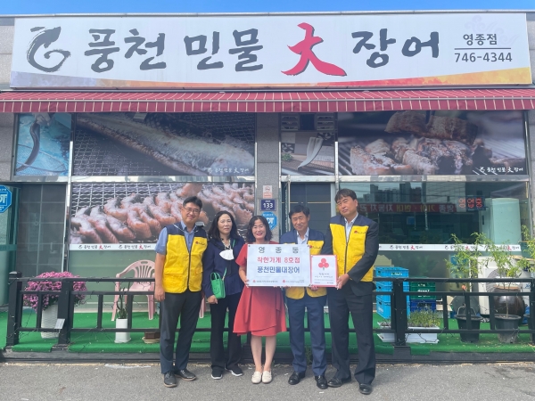 [금요저널] 인천 중구 영종동 지역사회보장협의체는 지난 22일‘착한가게’에 동참한 풍천민물大장어에 사랑의 열매 현판을 전달하고 감사의 뜻을 전했다.