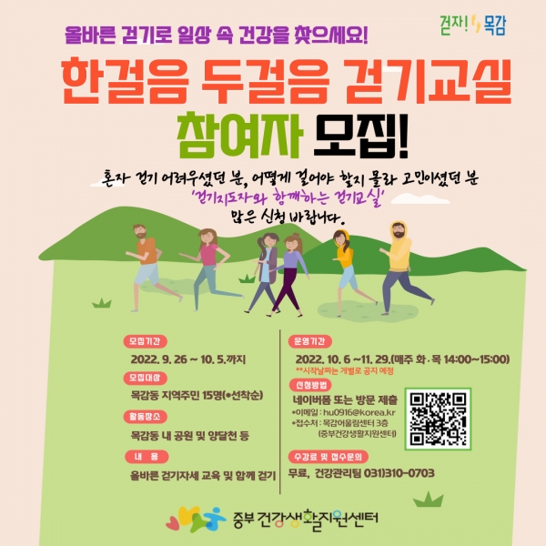 [금요저널] 시흥시는 중부권 지역주민에게 올바른 걷기를 알리고 걷기 실천율을 향상시키고자 하반기 ‘한걸음 두걸음 걷기교실’ 참여자를 오는 9월 27일부터 10월 5일까지 모집한다.
