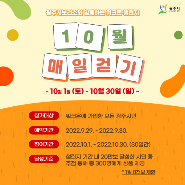 참여를 원하는 시민은 핸드폰에 모바일 걷기 앱 ‘워크온’을 설치한 후 광주시 공식 커뮤니티인 ‘광주시 워킹투게더’에 가입하고 10월 챌린지 ‘예약하기’ 또는 ‘참여하기’를 누르시면 누구나 손쉽게 참여할 수 있다.