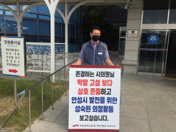 [금요저널] 전국공무원노동조합 안성시지부는 지난 28일 출근시간에 안성시 시의원들의 의정활동 중 공직자 간 상호 존중을 요구하는 1인 피케팅 시위를 진행했다.