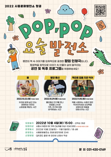 [금요저널] 시흥시가 독서 흥미를 배가시키며 어린이들의 상상력을 키워줄 참여형 인형극 ‘Pop, pop 요술발전소’ 참여자를 오는 10월 4일 오후 3시부터 선착순으로 모집한다.