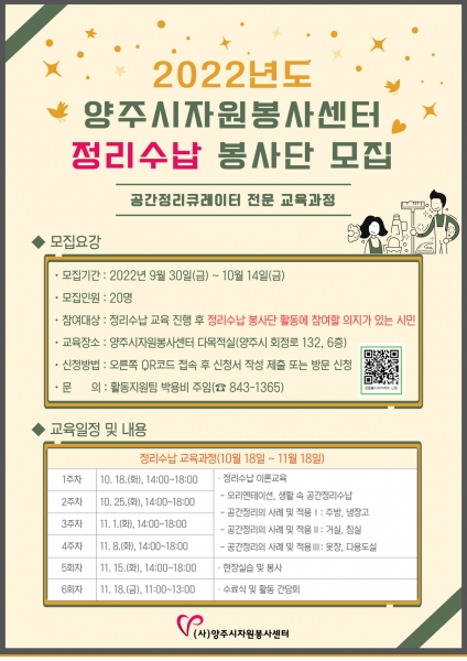 [금요저널] 양주시자원봉사센터는 30일부터 10월 14일까지‘정리수납 교육과정’에 참여할 신규자원봉사자와 일반봉사단체 회원 20명을 선착순으로 모집한다고 밝혔다.