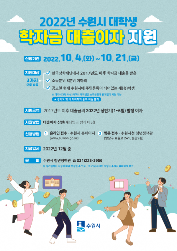 [금요저널] 수원시가 10월 4일부터 21일 오후 6시까지 ‘2022년 수원시 대학생 학자금 대출이자 지원 사업’ 대상자를 모집한다.