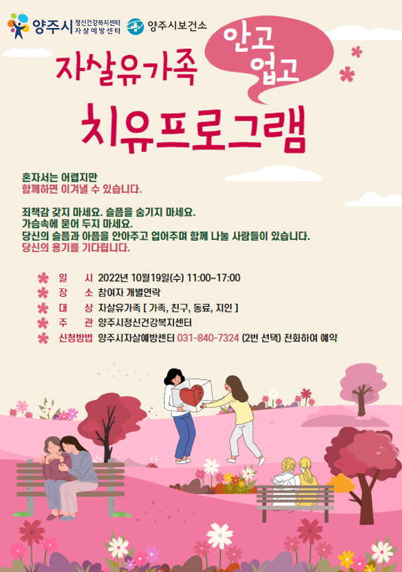 [금요저널] 양주시자살예방센터는 ‘세계 유가족의 날’을 맞아 자살유가족 치유프로그램 ‘안고 업고’ 참여자를 모집한다.