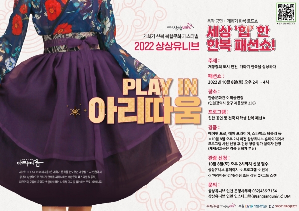 [금요저널] 인천중구문화재단이 후원하는 개화기 한복 복합문화 페스티벌 ‘2022 상상유니브 PLAY IN 아리따움’이 오는 8일 오후 2시 한중문화관 야외 공연장에서 개최된다.