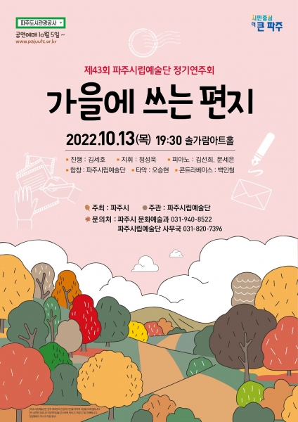 [금요저널] 파주시립예술단은 오는 13일 오후 7시 30분 솔가람아트홀에서 합창 정기연주회 ‘가을에 쓰는 편지’를 공연한다.