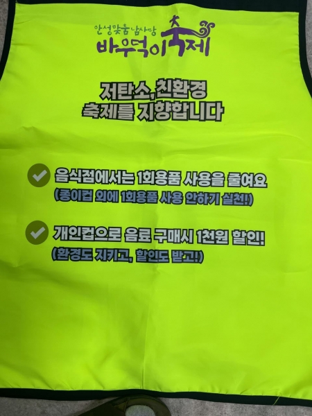특히 안성시 자원순환과에서는 쓰레기 없는 행사장을 만들기 위해 청소요원 조끼 뒷면에 ‘1회용품 사용을 자제하자’는 문구를 넣어 홍보하고 행사부스 및 음식점 테이블에 홍보스티커를 부착해 쓰레기 없는 축제장을 만들고자 노력했다.