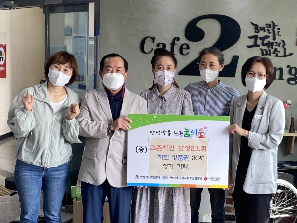 채정숙 안성2동장은 “고물가로 기부가 주춤할 시기에 어려운 청소년들에게 치킨을 정기 기탁해주셔서 감사드리며 기탁해주신 치킨 상품권은 대상자를 잘 선정해 매월 30가정에 전달해드리겠다”고 전했다.