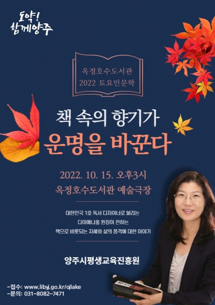 양주시 옥정호수도서관, 토요인문학 10월 강연‘책속의 향기가 운명을 바꾼다’개최
