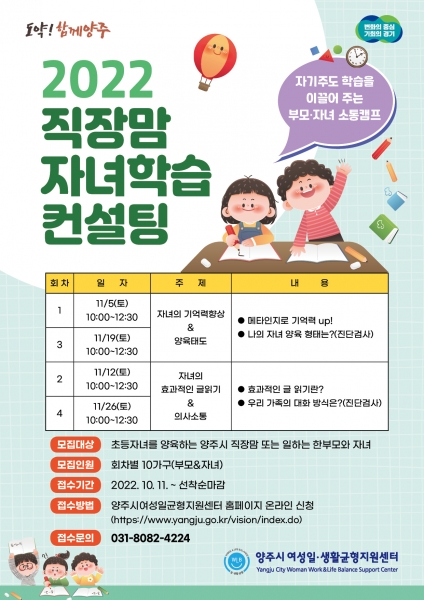 양주시에 거주하는 초등학생 자녀를 양육중인 직장맘이라면 누구나 무료로 참가 가능하며 프로그램은 양주시여성일·생활균형지원센터에서 대면으로 진행할 예정이다.