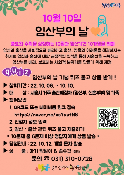 [금요저널] 시흥시 중부건강생활지원센터는 오는 10월 10일 임산부의 날을 맞아 퀴즈를 통해 임신과 출산에 대해 알아보고 임산부를 배려·보호하는 사회적 분위기를 조성하고자 ‘임산부의 날 기념 캠페인’을 운영한다.