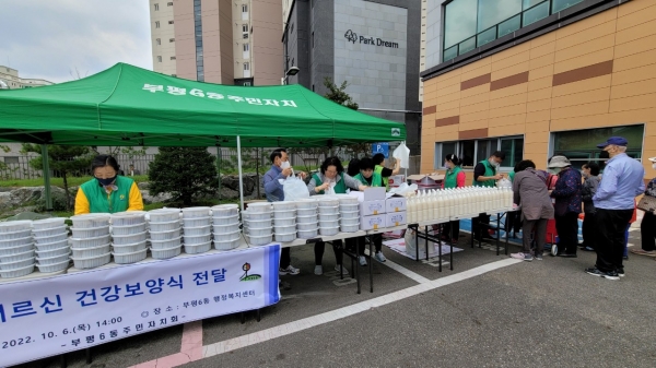 [금요저널] 부평구부평6동은 지난 6일 지역 내 노인들을 위한 건강보양식 나눔 행사를 진행했다.