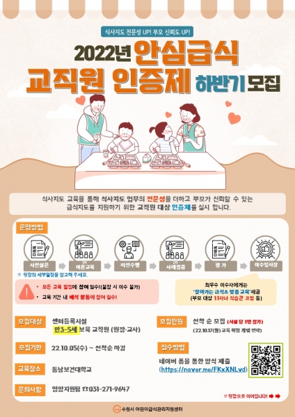 [금요저널] 수원시어린이급식관리지원센터가 ‘2022년 안심급식인증제’ 하반기 과정에 참여할 만3-5세 보육기관 교직원을 선착순으로 모집한다.