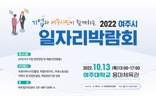 [금요저널] 여주시는 오는 13일 오후 1시부터 5시까지 여주대학교 용마체육관에서 구직자의 실업문제 해소 및 기업의 우수인재 채용을 위해 ‘2022년 여주시 일자리박람회’를 개최한다.